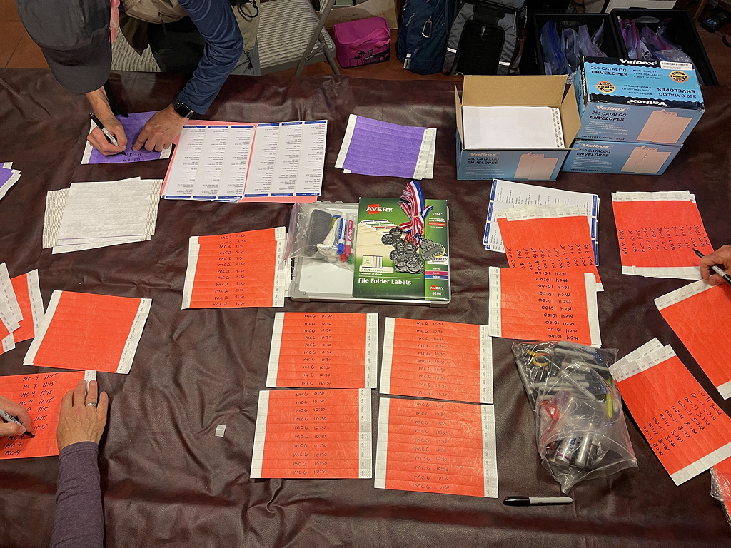Timing chip and bracelets: The race packet contains a velcro strap with your timing chip labeled with your chip number, as well as two security bracelets. Put these things on before you leave the house on race day morning, or when your receive them at the event, where a volunteer can help you put them on.