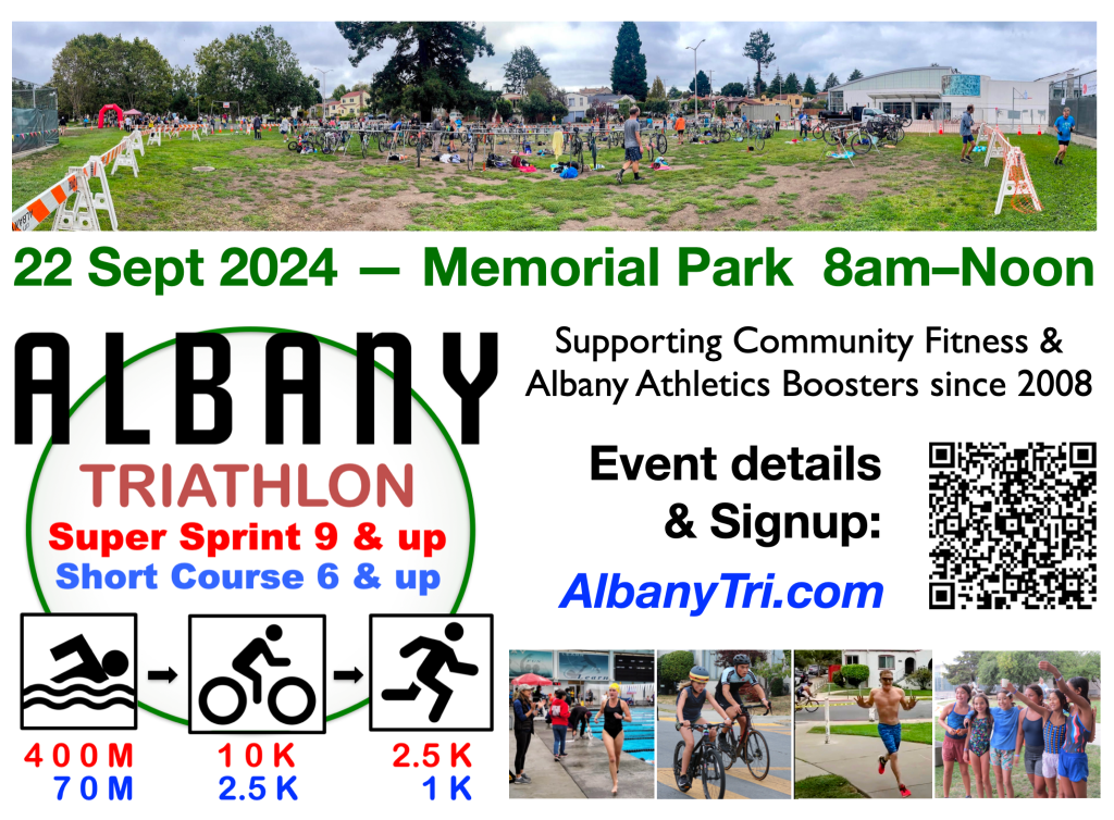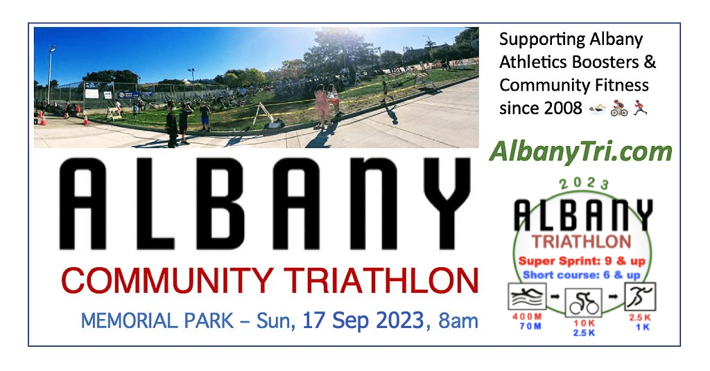 The 2023 Albany Community Triathlon takes place on Sunday September 17 at 8am at Albany Memorial Park. Our “Super Sprint” distance multi-loop course is beginner-friendly, family-friendly, and spectator friendly with a pool swim in your own split lane. The event takes place at the same great venue & course as last year, though minus the portable classrooms that had been alongside our transition area for the past 3 years â recently removed now that Marin school is reopening.